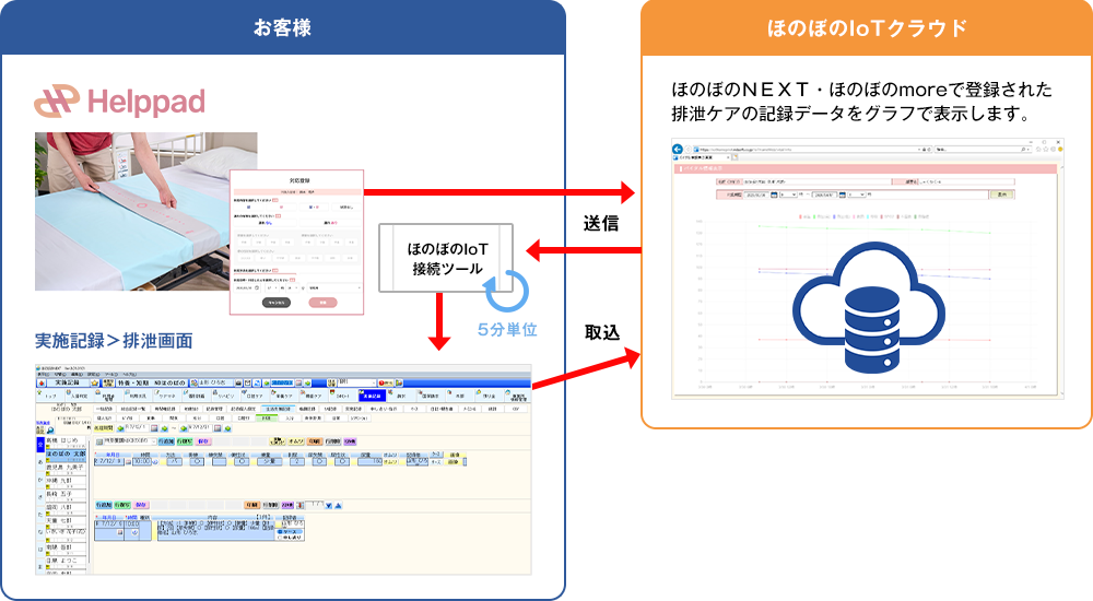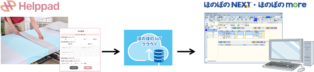 Helppad2のセンサー情報をほのぼのIoTクラウド経由でほのぼのNEXT・ほのぼのmoreへ取込み、転記・記録の時間を削減します。