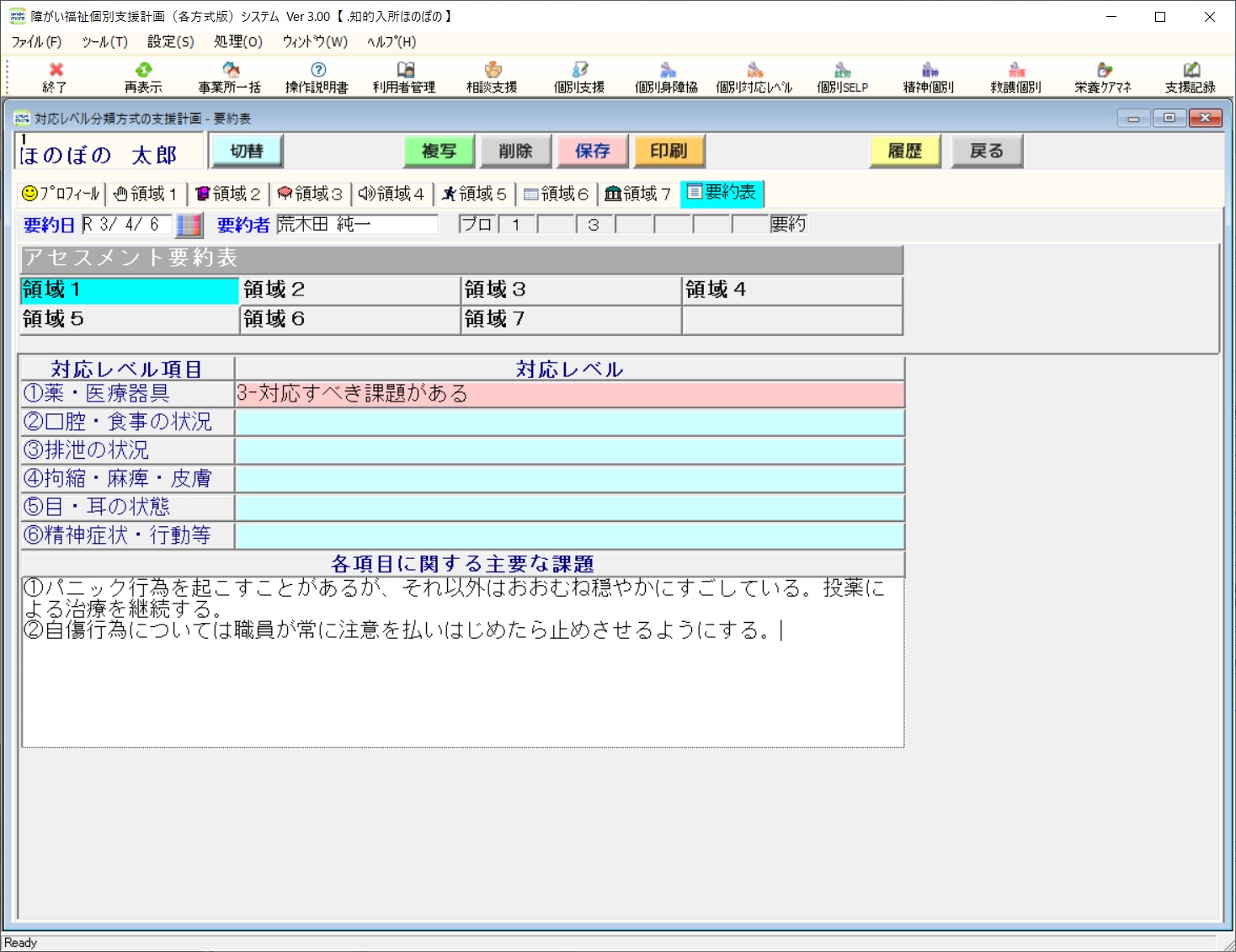 - 作業/食事/バイタル/入浴/服薬などの日々の登録データを収集し、ケース記録を作成します。